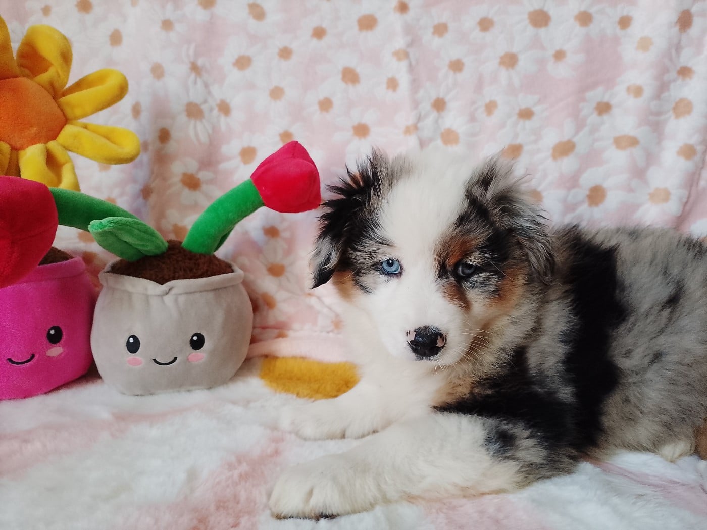 Chiot femelle N°6. Bleu merle aux yeux marrons